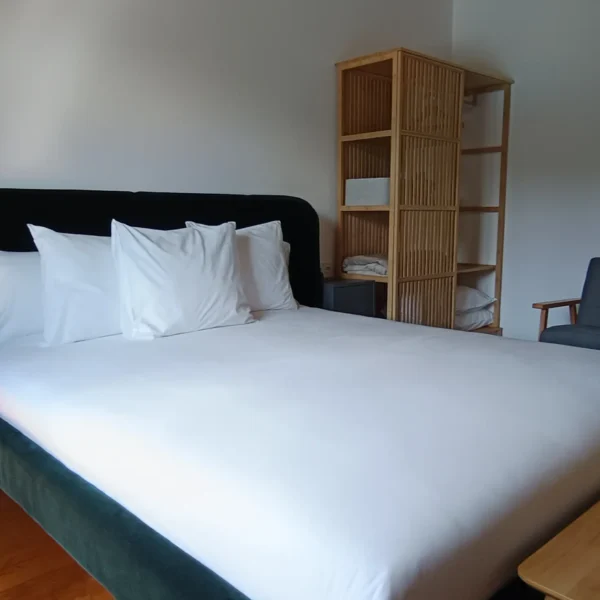 Cuenta con gran ventanal con vistas a la montaña, cama de matrimonio de 1’60×2’00, climatización, minibar, hervidor de agua y artículos de cortesía.